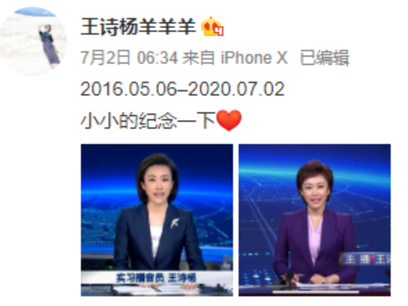 王诗杨由实习播音员转正为“主播”。