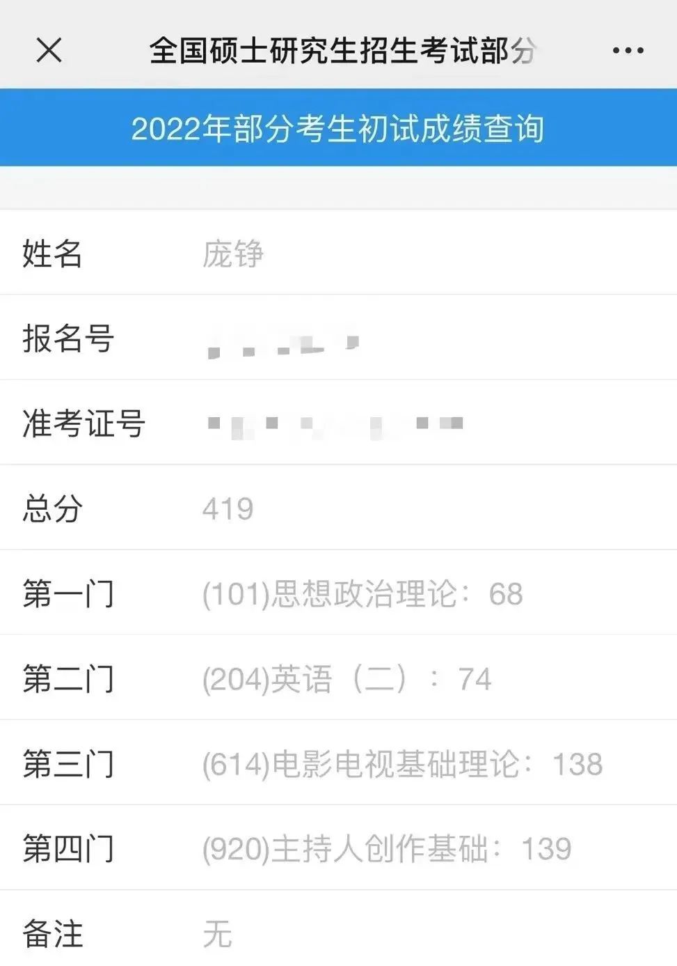 2022年2月,上戏考研初试放榜,打开考试查询界面那一刻,庞铮满是震惊,她丝毫没有想过自己笔试成绩竟高达419分,而就在考试不久前,她还正经历着特殊的部队生活,实在学不下去,打算换个新环境继续学的情况。