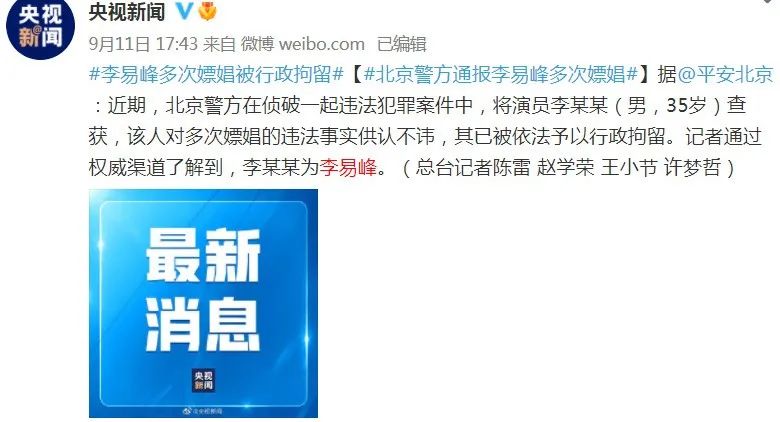 9月11日,演员李易峰因多次嫖娼被北京警方通报。