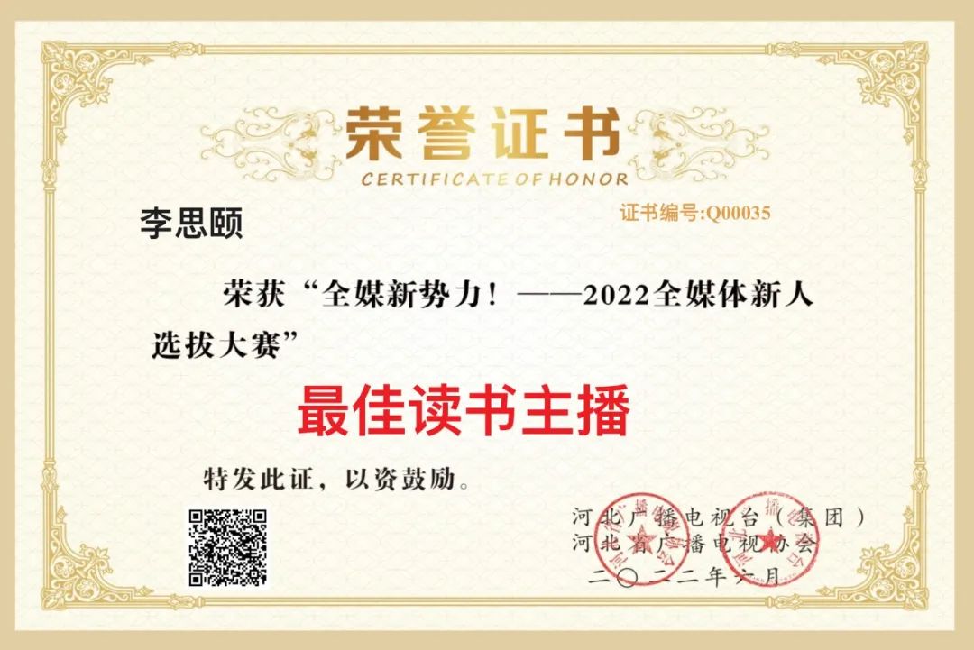 2022年4月,河北广播电视台全媒新势力大赛获最佳读书主播奖项;