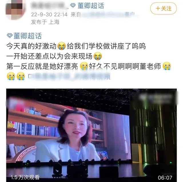 本来此次活动为线下活动,如今改成了线上录制的模式,不过董卿状态一如既往,当她的视频出现在现场的那一刻,场内学生也相当激动。