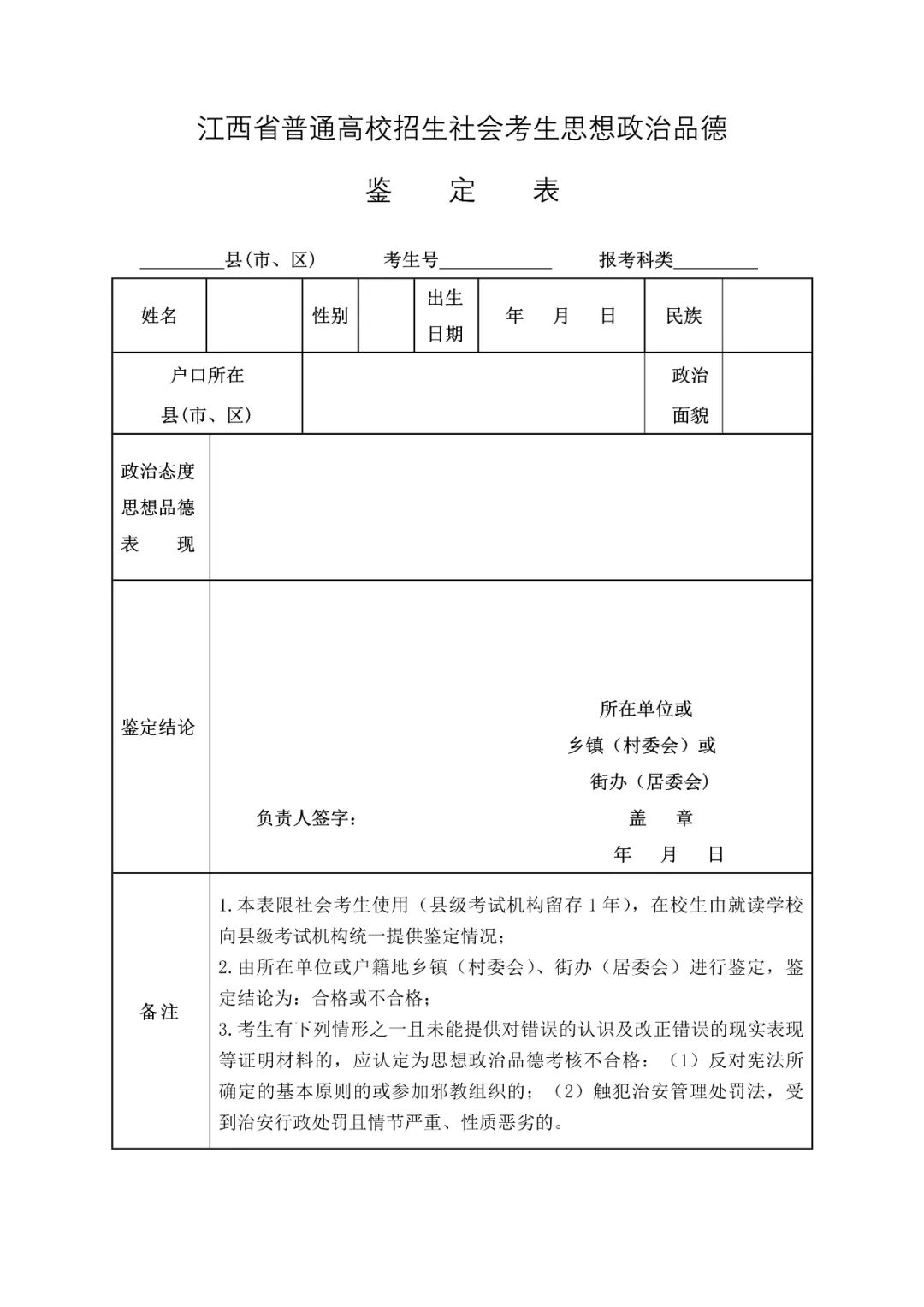 江西省普通高校招生社会考生思想政治品德鉴定表(2023)