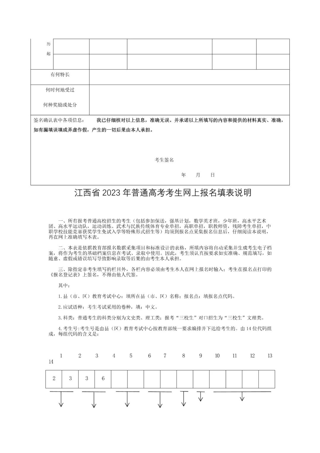 (五)网上报名。11月1-7日,考生本人凭考生号及密码自行登录“江西省教育考试院网”(http://www.jxeea.cn)或“江西教育网”(http://jyt.jiangxi.gov.cn),认真阅读(逐一点击确认)《江西省2023年普通高考网上报名须知》等应知事项,并签订《考生诚信承诺书》,如实填写《江西省2023年普通高考报名登记表》(以下简称《报名登记表》,样表见附件2,该表将作为高校录取依据的电子档案材料之一,不得漏填和虚假填报,否则后果自负)。没有上网条件的考生可到报名点进行网上报名。