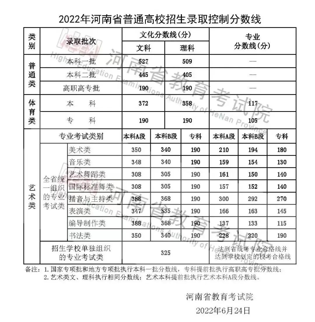 2022年我省艺术类各批次文化录取控制分数线为: