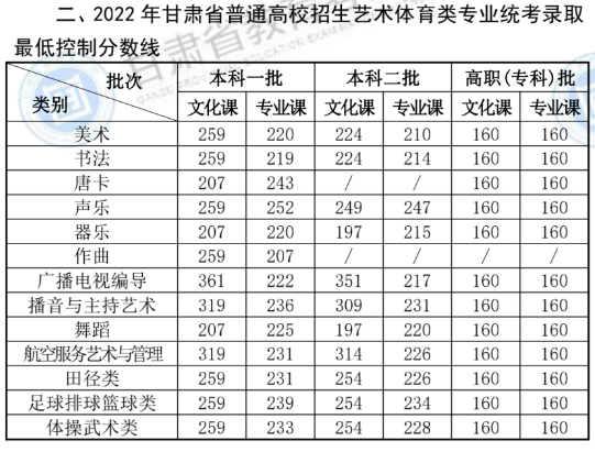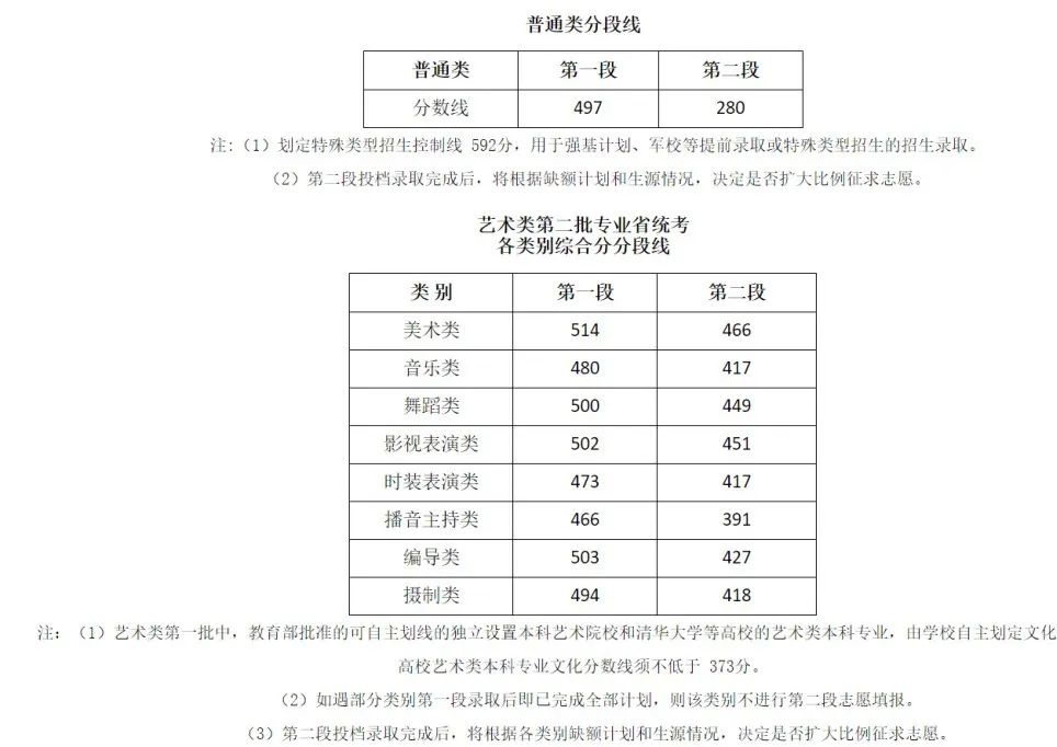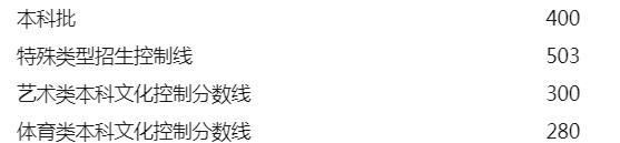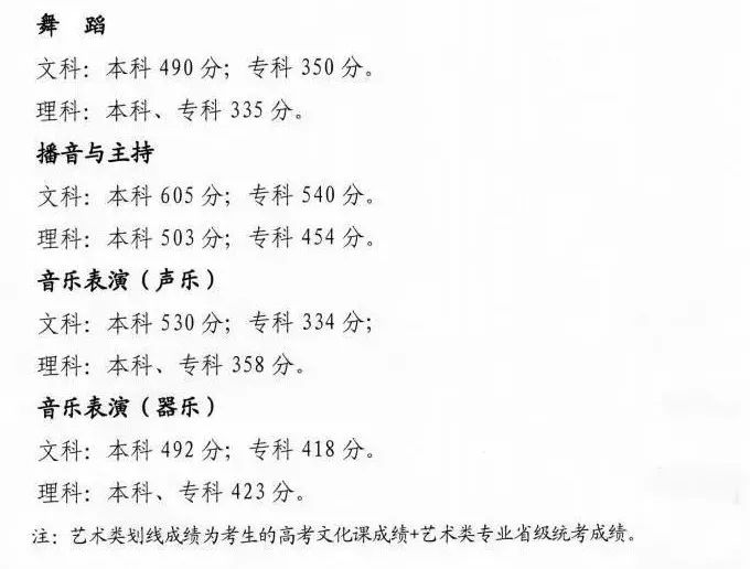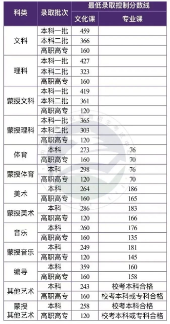 艺术类专业的录取由文化分数线和艺术统考分数线双线控制。各批次的录取最低控制分数线分别为: