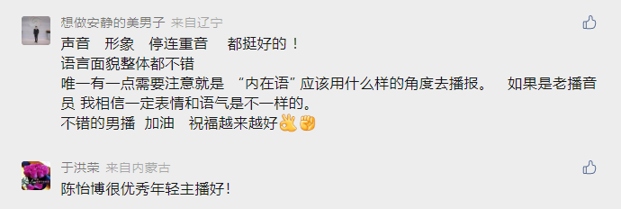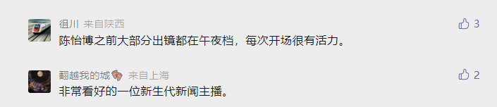 “我几乎每天都看央视新闻频道《午夜新闻》,所有主持人里面,只有陈怡博每次开头说‘大家晚上好!’充满朝气,让人觉得你看的不是《午夜新闻》,是《朝闻天下》。