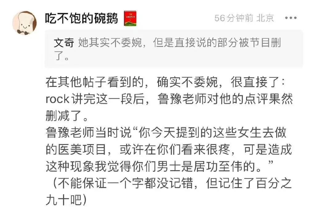 后来,有现场观众说鲁豫的点评被剪掉了几句,表达的意思是作为容貌焦虑的制造者(男性),去讲容貌焦虑,就更加不合适。
