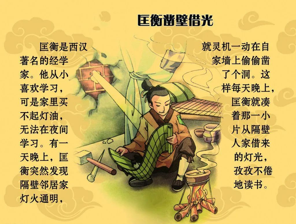 我们从小都知道,“匡衡字稚圭;勤学而无烛;邻舍有烛而炽不逮;衡乃穿壁引光;以书映光而读书。(晋·葛洪《西京杂记》)”