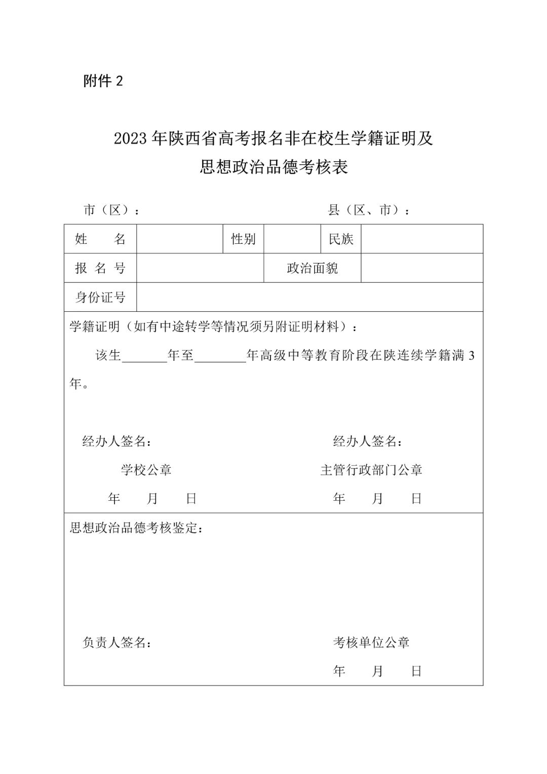 非在校生报考者,须提供《2023年陕西省高考报名非在校生学籍证明及思想政治品德考核表》(附件2)。