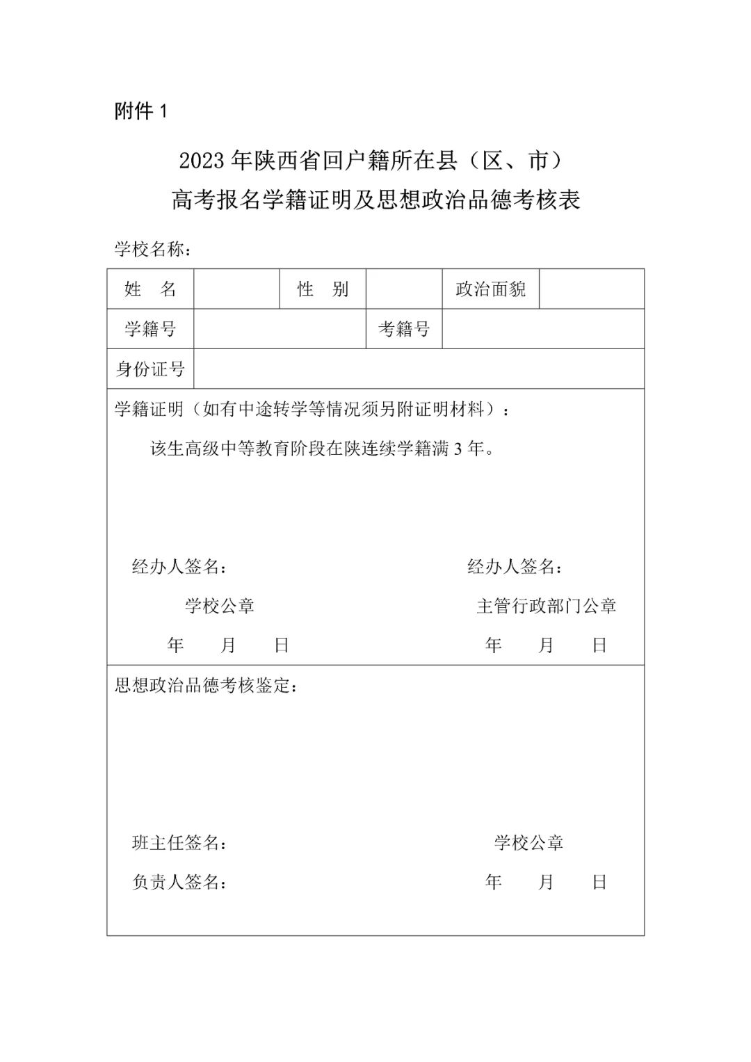 1.2023年陕西省回户籍所在县(区、市)高考报名学籍证明及思想政治品德考核表