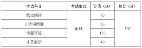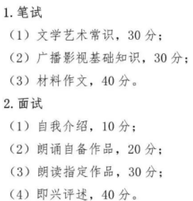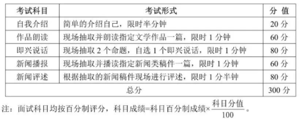 第二科目:普通话语音(自备文学稿件、指定文学稿件),满分为150分。每科满分为150分,总成绩根据各科权重系数(综合专业素质1.2、普通话语音0.8)折合为300分。二、考试形式面试,考生考试时不允许化妆。
