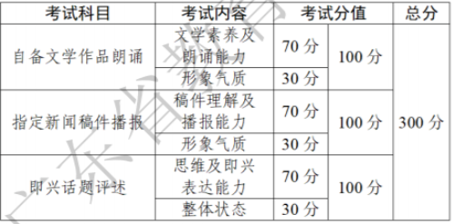 考试科目为5科,分别为形象气质、作品朗读、新闻播报、即兴评述和模拟主持。满分300分,其中,形象气质20分,作品朗读40分,新闻播报80分,即兴评述80分,模拟主持80分。
