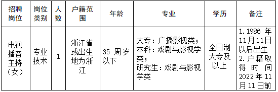 根据《浙江省事业单位公开招聘人员暂行办法》有关规定,浦江县融媒体中心(浦江县广播电视台)决定面向社会公开招聘电视播音主持1名(女)。现将招聘工作有关事项公告如下: