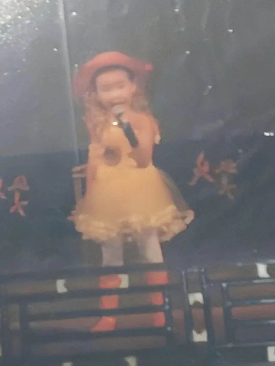 图片中穿着阳日葵套装,用自己小小的手拿起话筒,张大嘴站在舞台前的小女孩儿便是曹芷嘉,不过这时可不是在主持,而是在唱歌。
