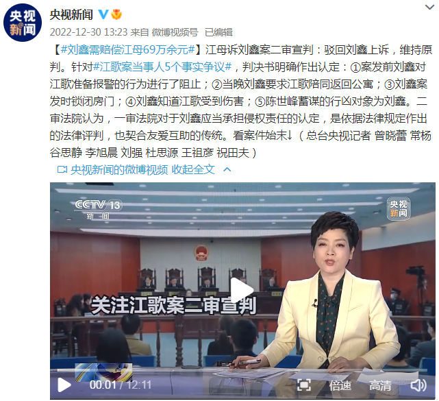 2022年12月30日,山东省青岛市中级人民法院对万众关注的江歌案做出二审宣判:驳回上诉,维持原判。刘鑫现已改名刘某曦。二审案件受理费10760元,由上诉人刘鑫负担。判决依法向双方当事人送达。