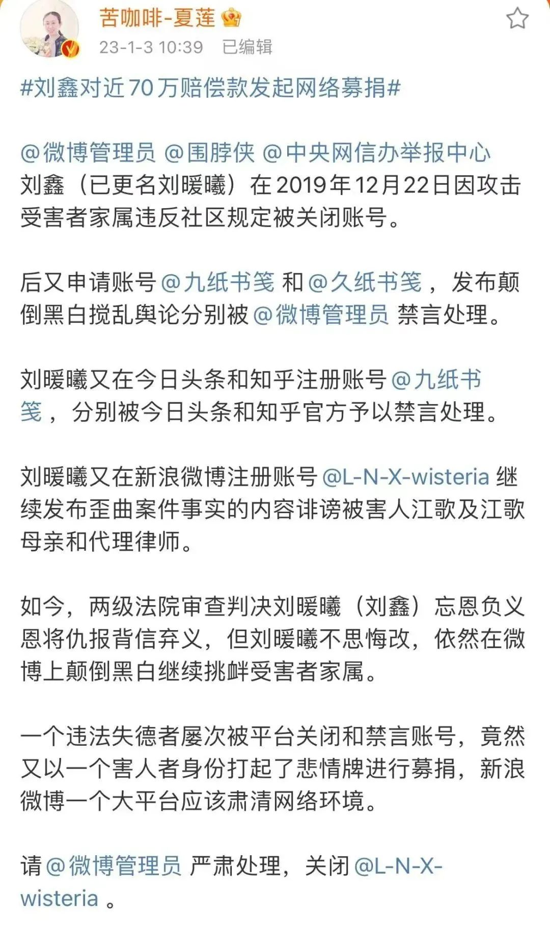 面对刘鑫这一举措,1月3日,江歌妈妈江秋莲发文控诉刘鑫对赔偿款发起网络募捐,引发众多网友关注。