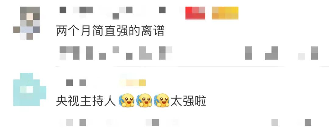 网友留言:“两个月简直强得离谱”、“央视主持人太强啦”、“两个月!想都不敢想,太猛了”。