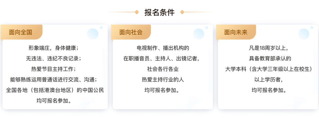 《中央广播电视总台2023主持人大赛》从2023年4月23日17:00开始报名,想要报名的小伙伴请点击文末“阅读原文”,进入报名通道!
