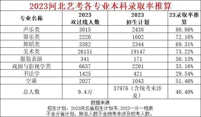 据统计,2023年河北省艺术类考生双过线人数9.4万人,而计划招生人数37976人,录取率在40.40%。详情如下: