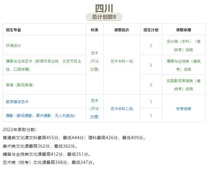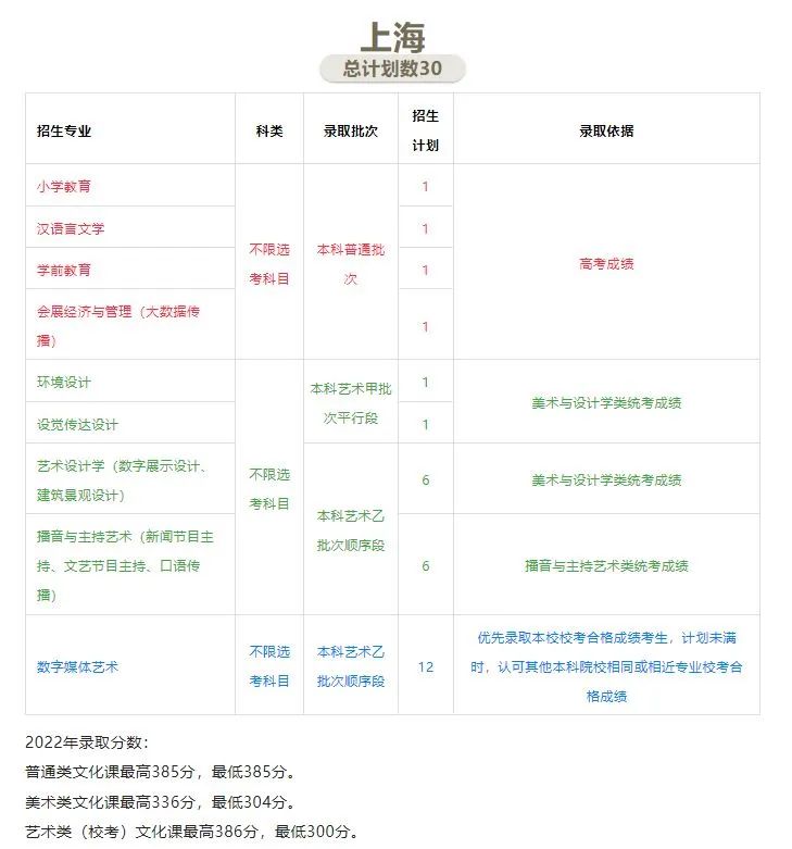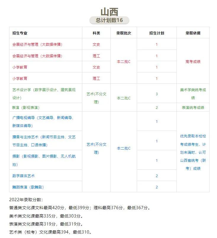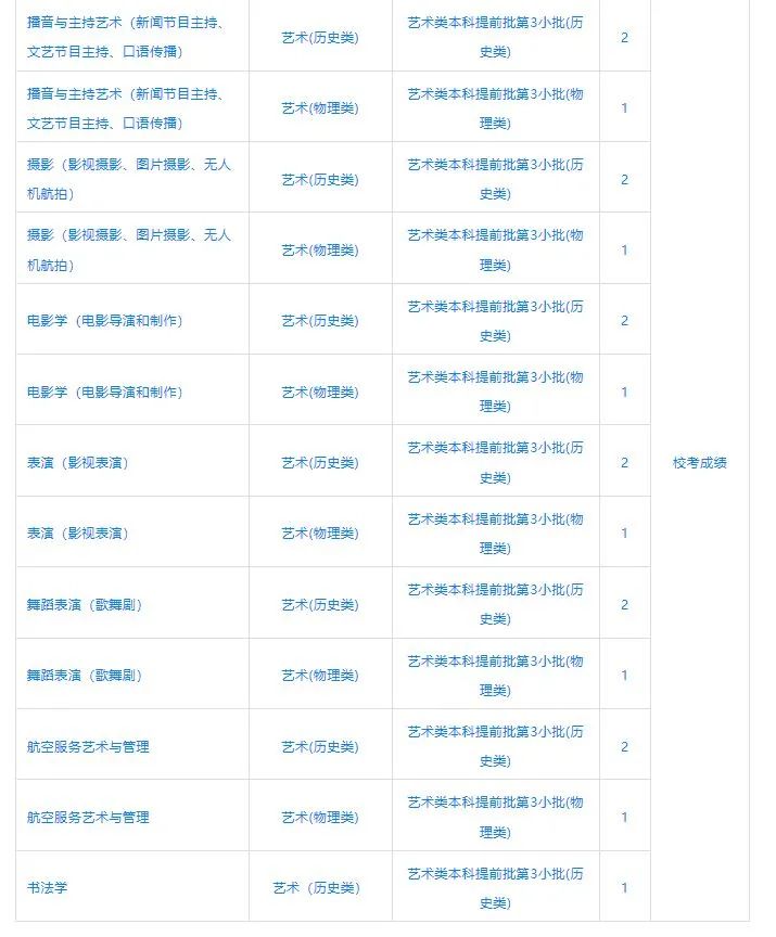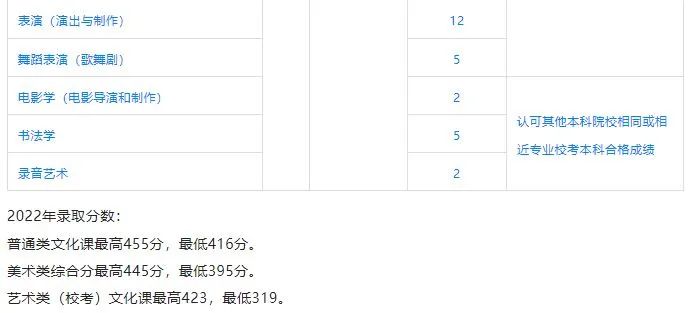 4、艺术类专业注意事项:对于使用我校校考成绩进行录取的艺术类专业,部分省份优先录取具有本校校考合格成绩的考生;从第一志愿开始,计划未完成时,认可其他本科院校相同或相近专业的校考合格成绩。