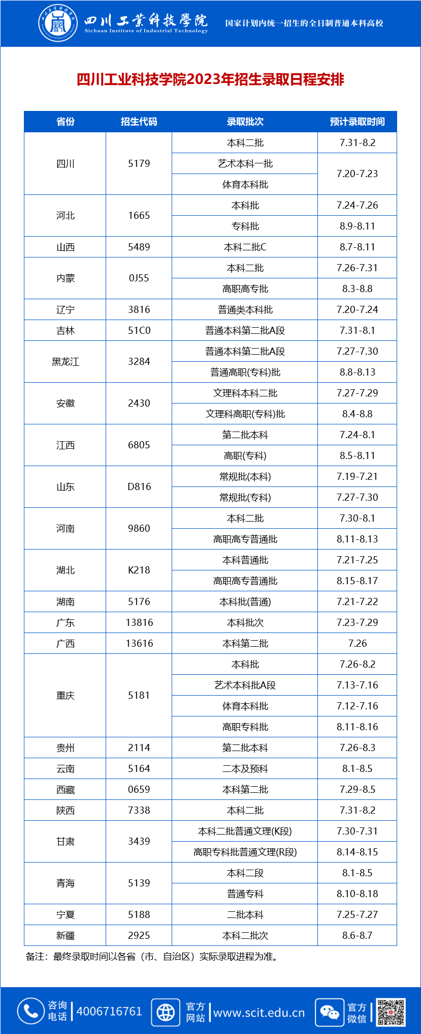 普通本科批次:7月16至7月24日