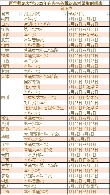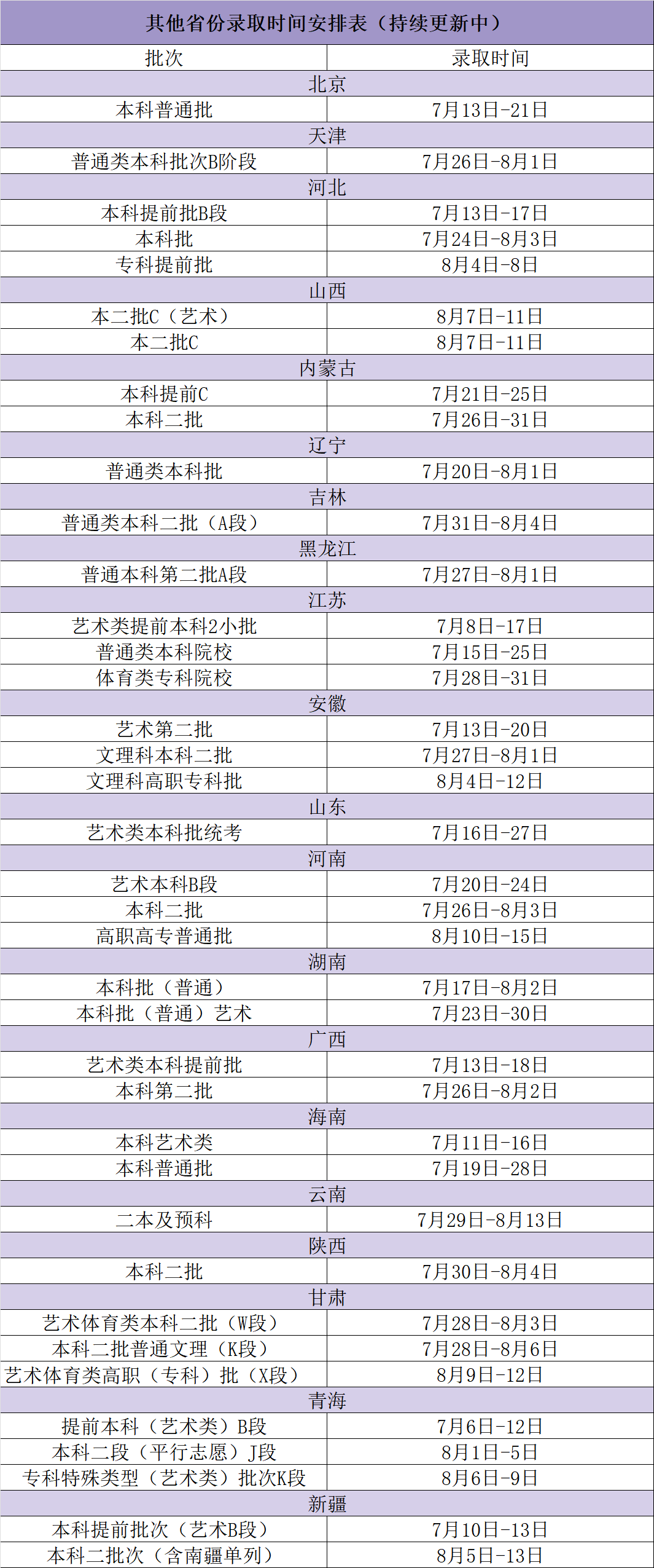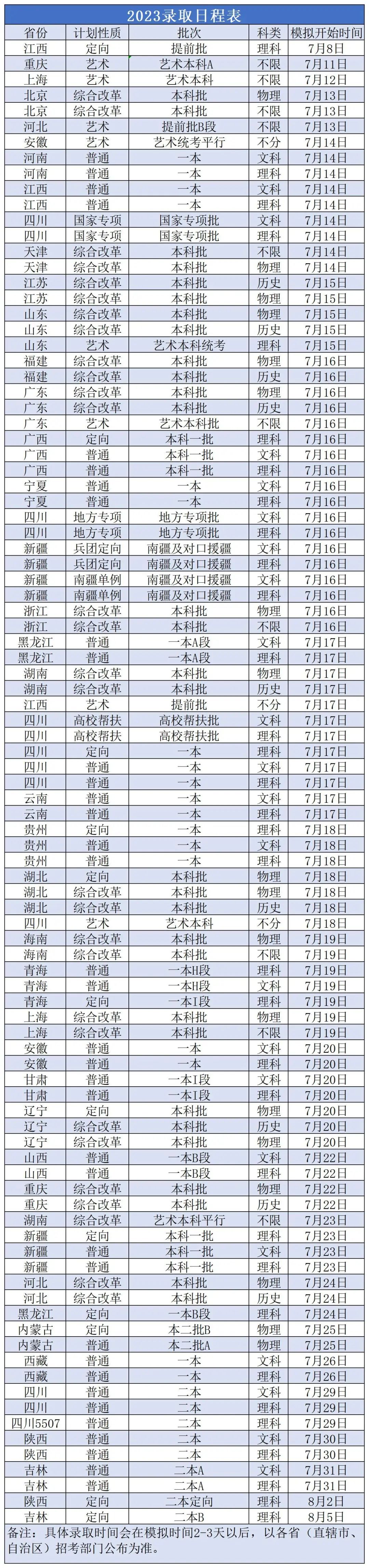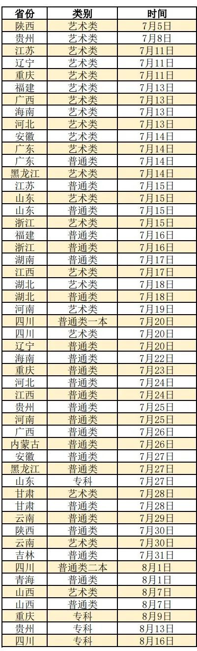 其他省份录取时间安排表