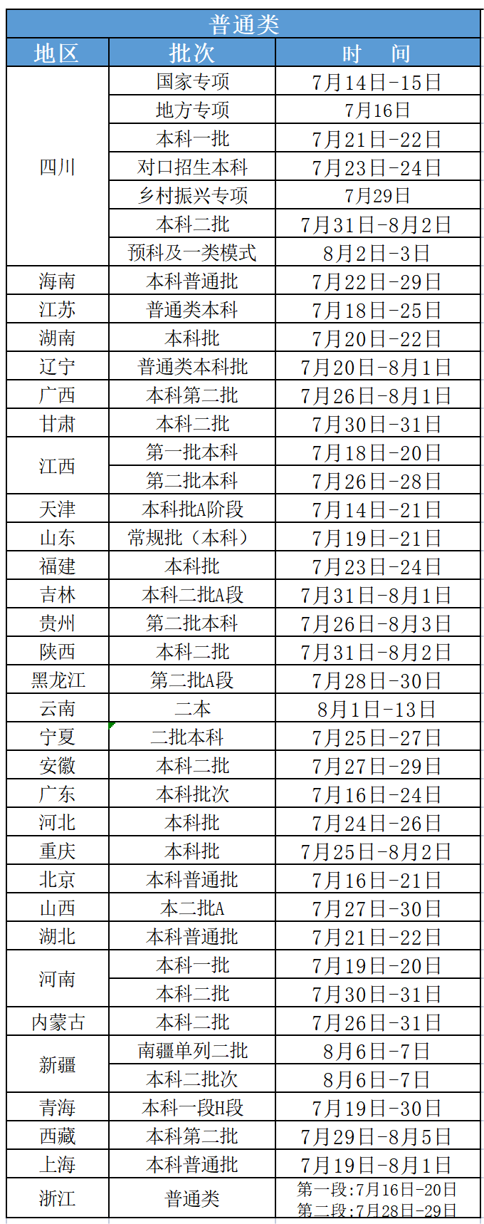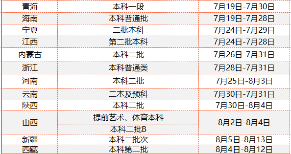 普通本科批:7月18日至8月3日