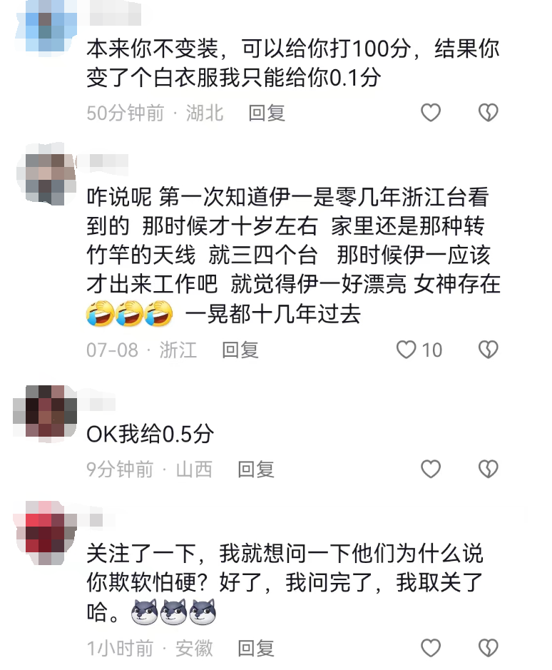 不过,也有网友在评论区里表达了对伊一的肯定:“咋说呢,第一次知道伊一是零几年浙江台看到的,那时候才十岁左右,家里还是那种转竹竿的天线,就三四个台。那时候伊一应该才出来工作吧,就觉得