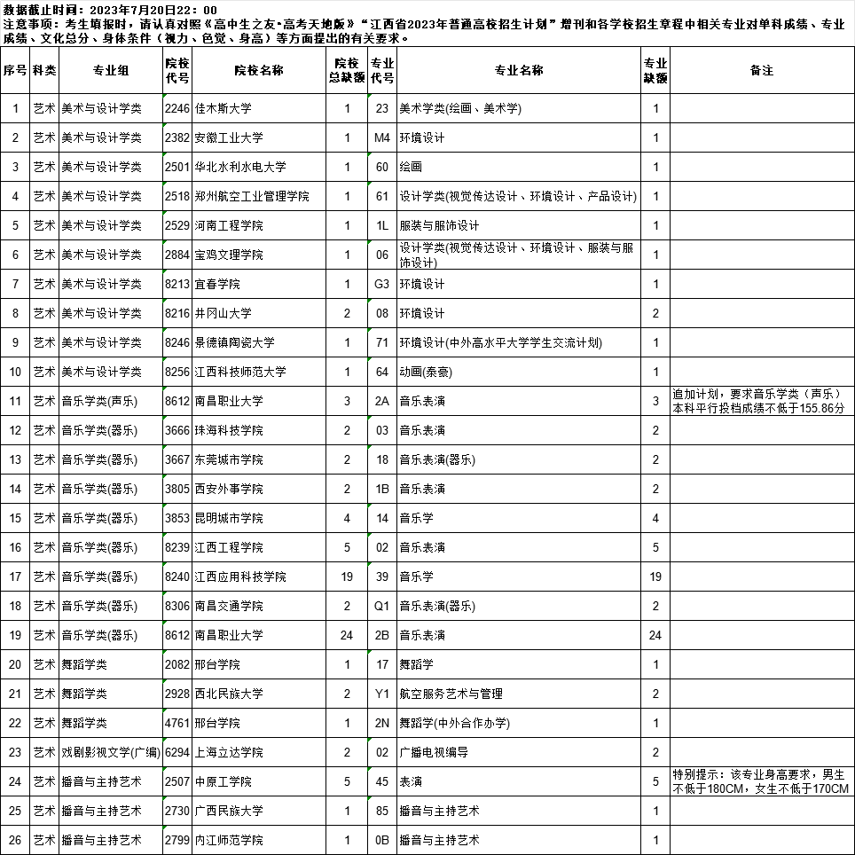 江西省2023年普通高校招生艺术本科平行志愿缺额院校及专业统计表公布