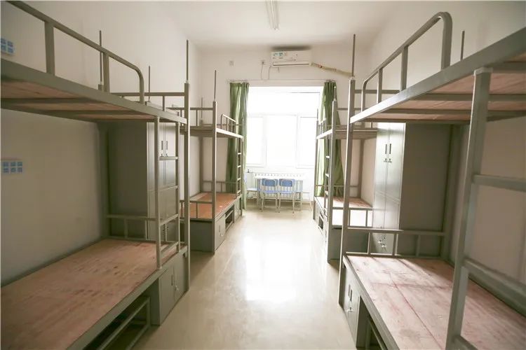 A:学校宿舍实行公寓化管理,有六人间上床下桌没独卫,公共浴室有浴帘隔板,也有六人间上下铺有独卫。八人间没有上床下桌但有独立卫浴。宿舍内每个人有一个小柜子来放杂物,一张桌子和一把椅子。