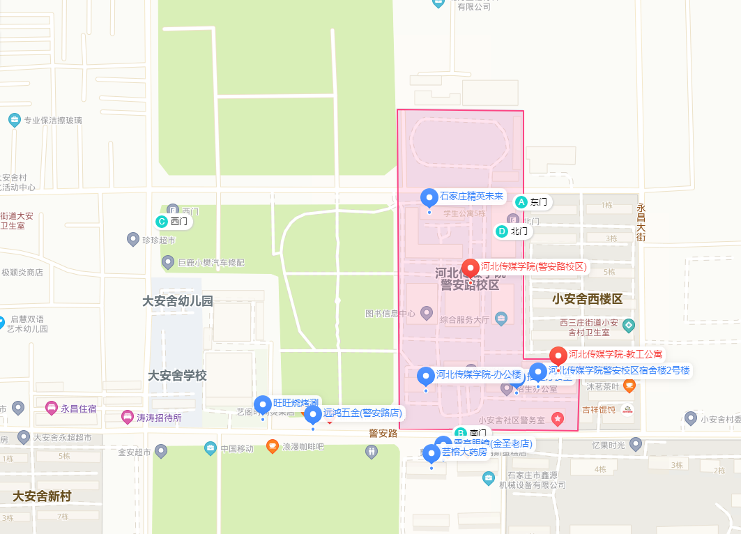 ,兴安校区地址为河北省石家庄市栾城区兴安大街109,警安校区地址为石家庄市新华区警安路8号,鹿泉校区地址为河北省石家庄市鹿泉区双同路9号。