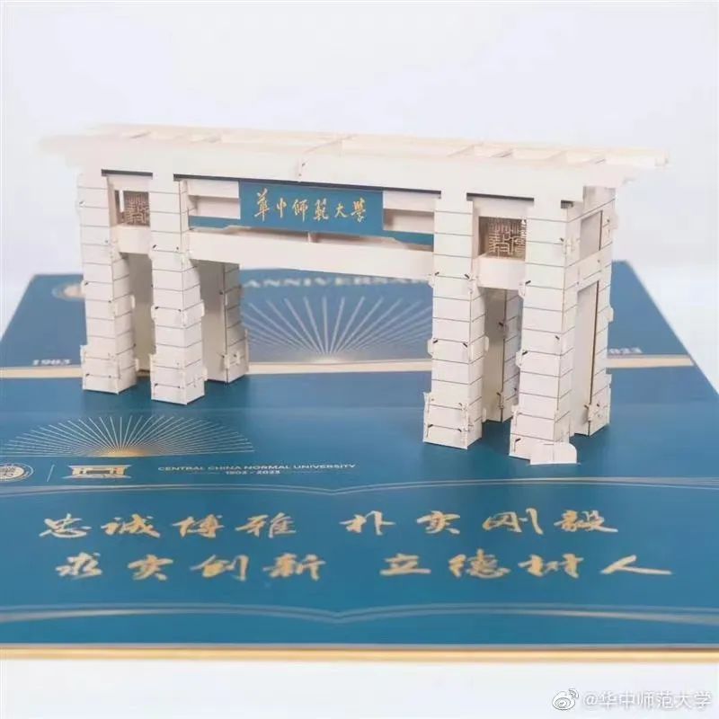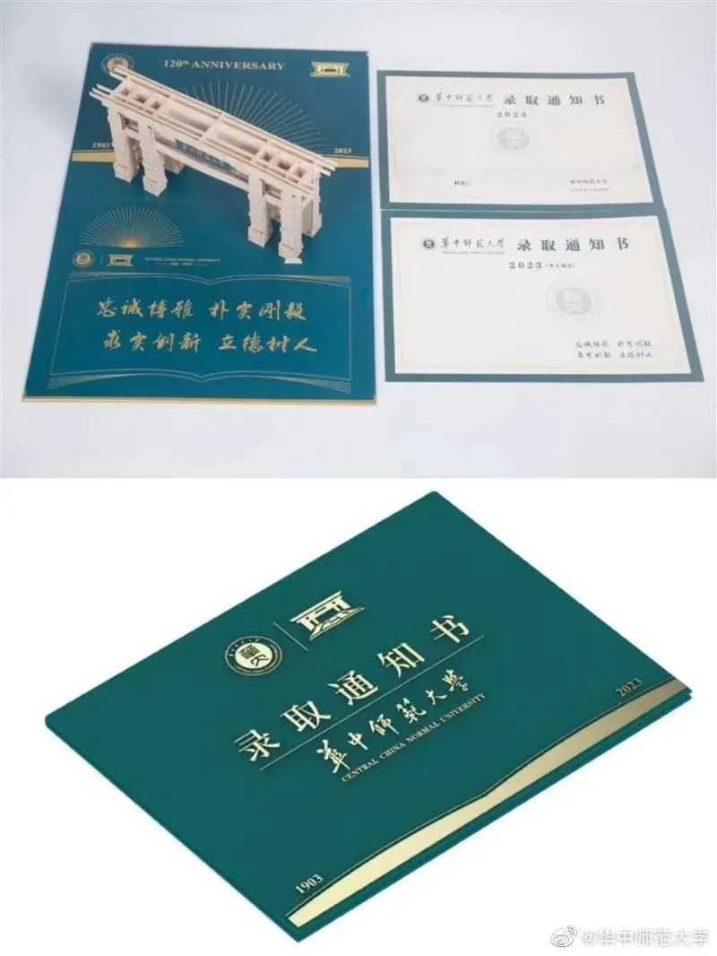 华中师范大学2023级录取通知书以横开本形式折叠,顶部华师校徽,底部书页造型,华师绿与金色交相辉映,庄重沉稳,典雅和谐。打开通知书的第一时间,入眼即是激光雕刻拼装构成的立体华中师范大学南门模型,未至华师大,先闻华师韵。
