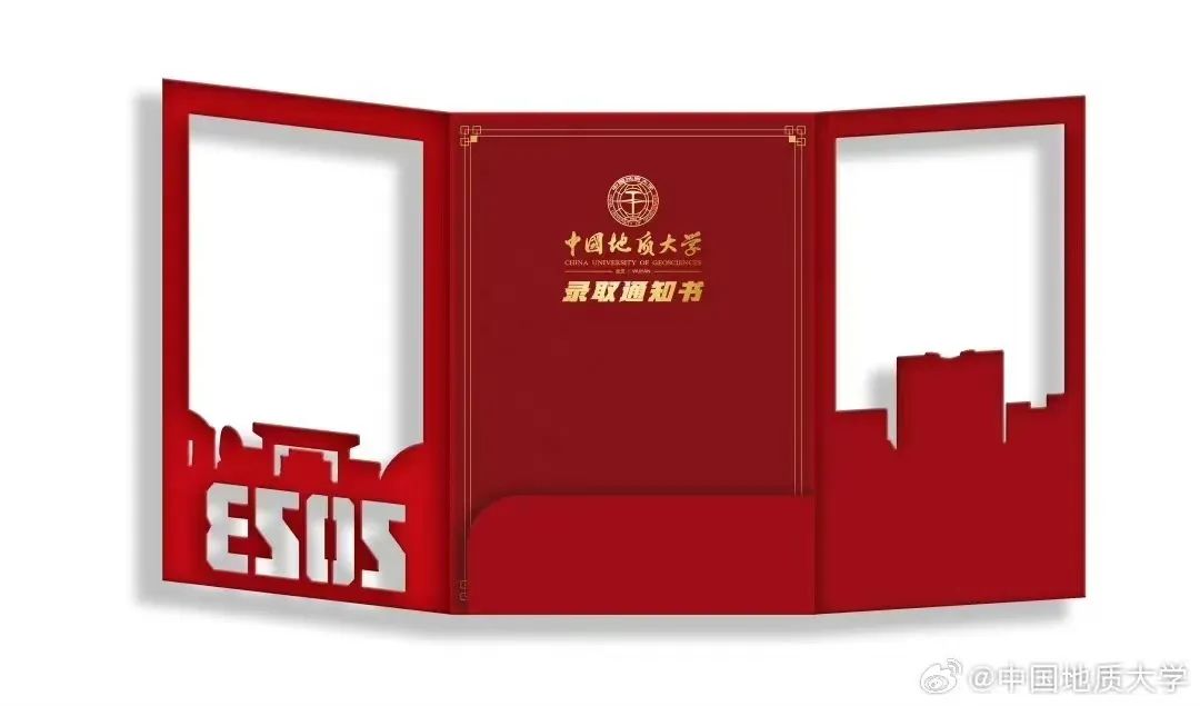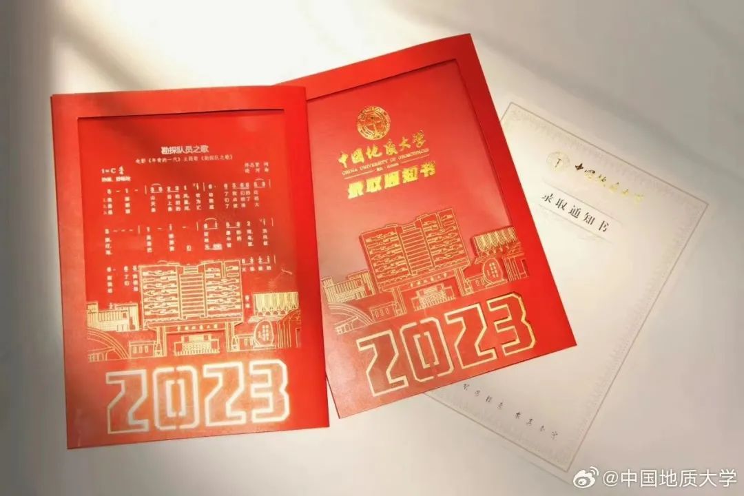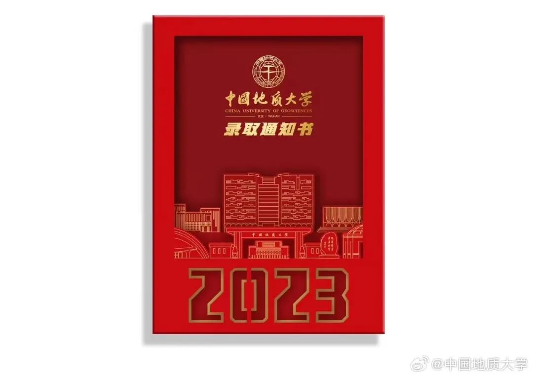 2023中国地质大学(武汉)本科录取通知书以《南望追梦 未来可期》为名。录取通知书由封套和正本组成,封套采用了镂空激光雕工艺,第一层为“南望山校区主体建筑”,第二层为“未来城校区主体建筑”。整体为“视窗化”的表现形式,轻启封套,如透过“南望视窗”和“未来视窗”,一份轻羽却厚重如山的正本录取通知书跃然纸上,正本通知书采用烫印金色工艺,艰苦朴素,求真务实的校训让每位学子都印刻在心中。