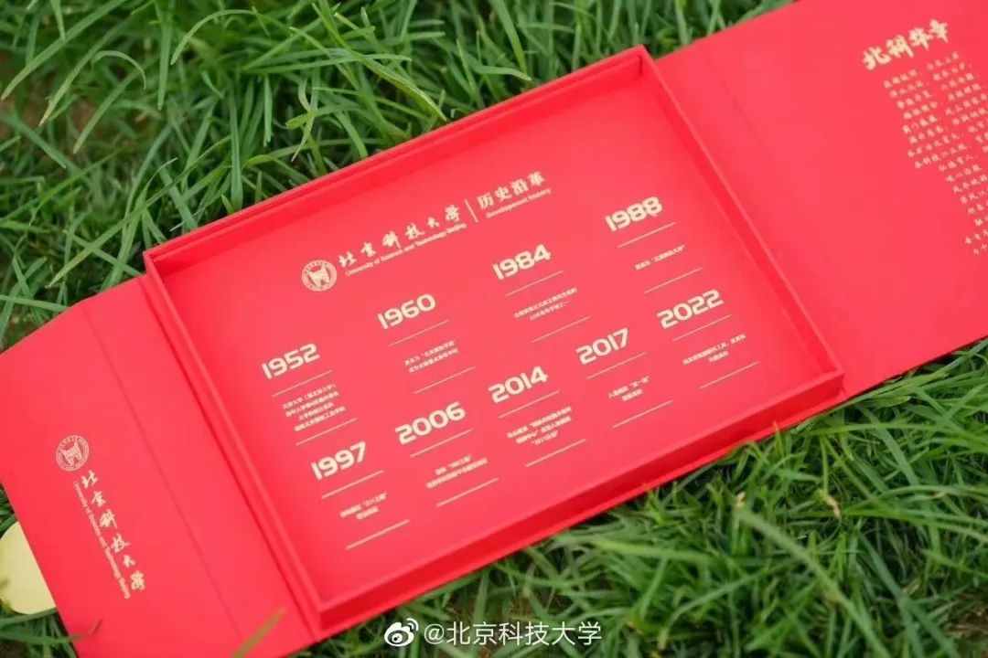 北科大同样取材于学校的科研成果,北京科技大学2023年新版本科生录取通知书,主体由北科大教师团队和校友团队携手研发的高品质超薄钢“5G钢”制作而成。
