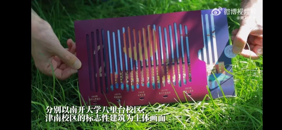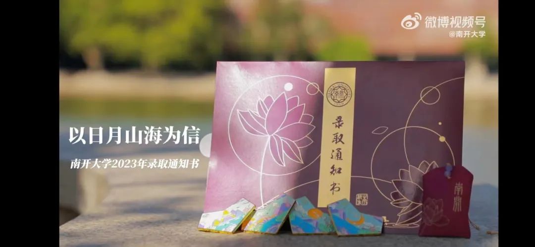 南开大学2023年录取通知书整体依旧沿用封套设计,分别以南开大学校区的标志性建筑为主体画面,随着抽拉变化,日月相互交替,与南开校训“允公允能、日新月异”相合。