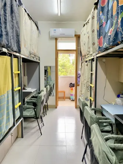 A:六人间,有空调、独立卫生间有一个小阳台,床的规格有两种的,上下铺式的旁边有书桌和电脑