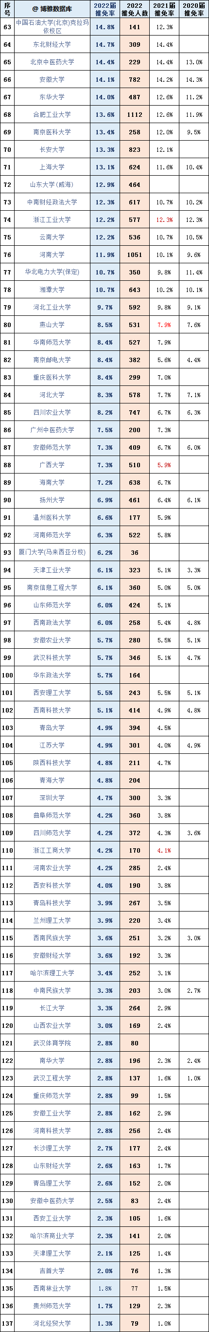 这137所高校2022届本科生总数66.16万人,推免公示8.38万人,