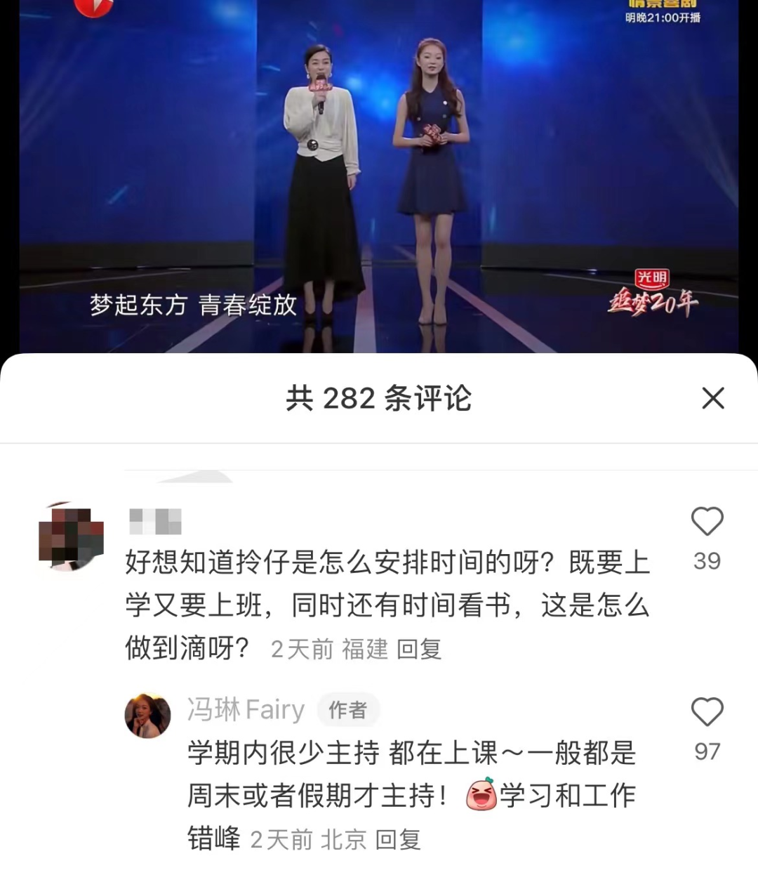 冯琳回复:“学期内很少主持,都在上课~一般都是周末或者假期才主持![开心]学习和工作错峰。”