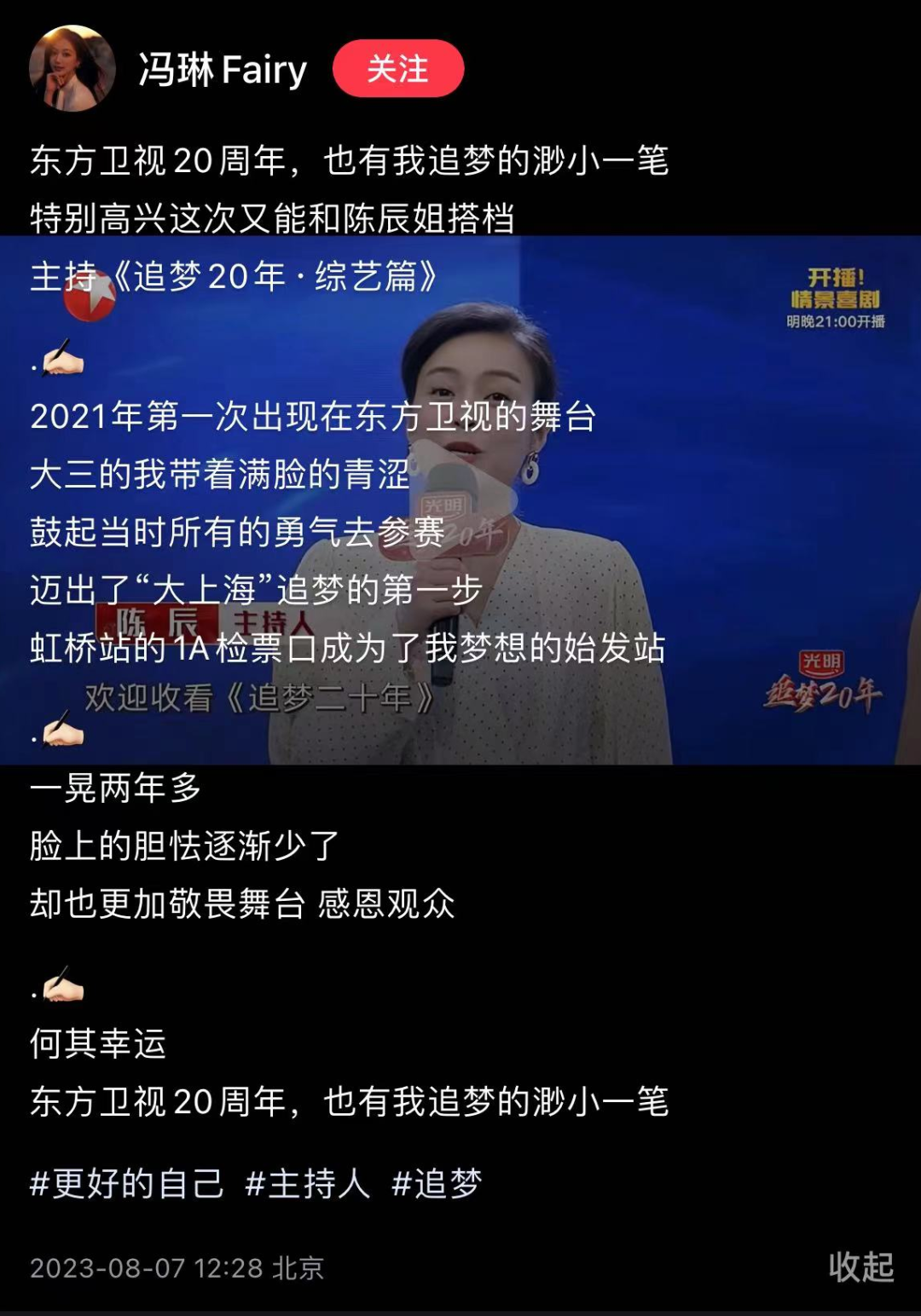 8月7日,东方卫视主持人冯琳在自己的社交平台上发布了视频,她透露自己搭档东方卫视主持人陈辰,主持回顾东方卫视20周年系列节目:《追梦20年·综艺篇》。