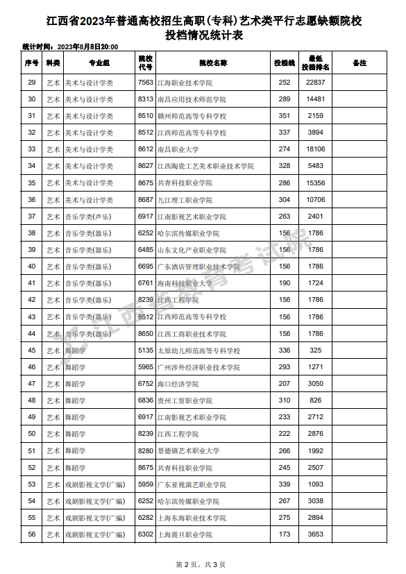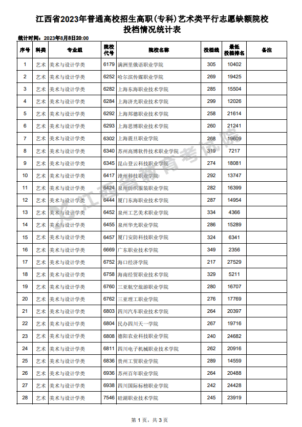 江西省2023年普通高校招生高职(专科)艺术类平行志愿缺额院校投档情况
