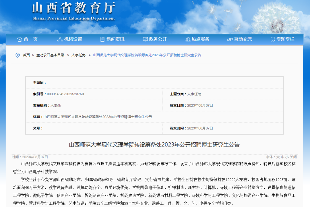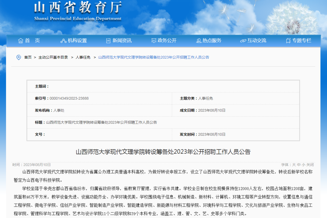 今天,山西省教育厅发布了关于山西师范大学现代文理学院转设筹备处公开招聘工作人员公告。