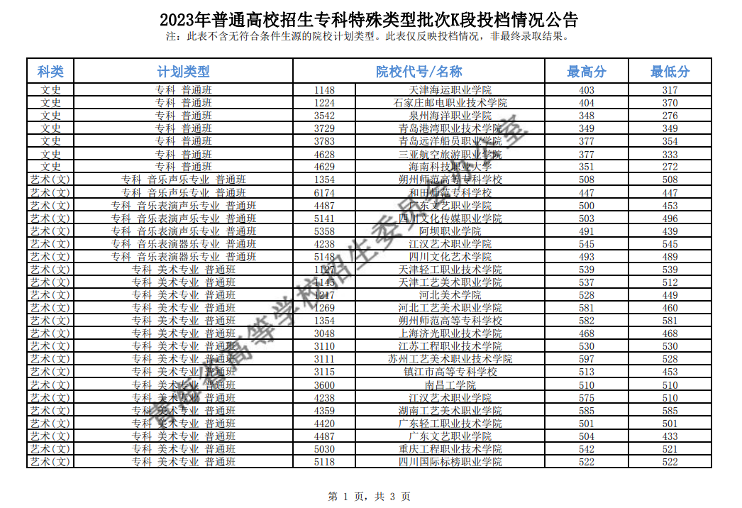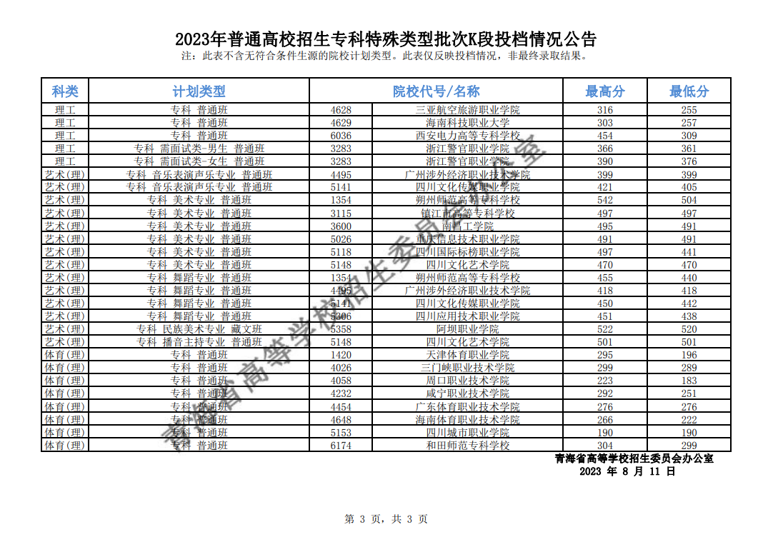 青海省2023年普通高校招生专科特殊类型批次K段投档情况公告