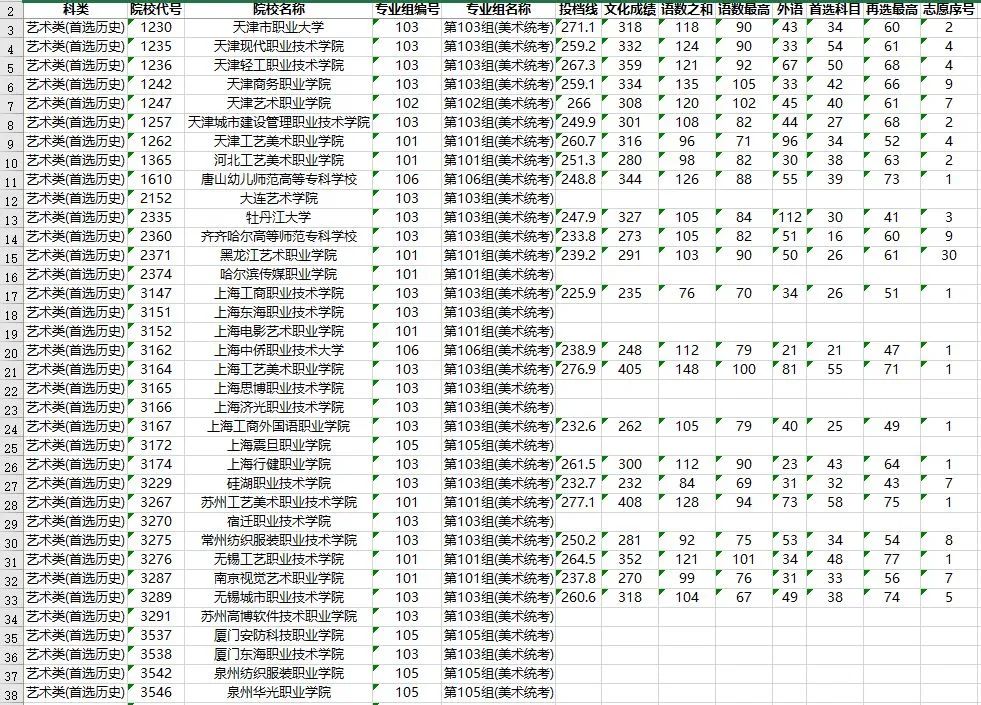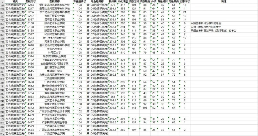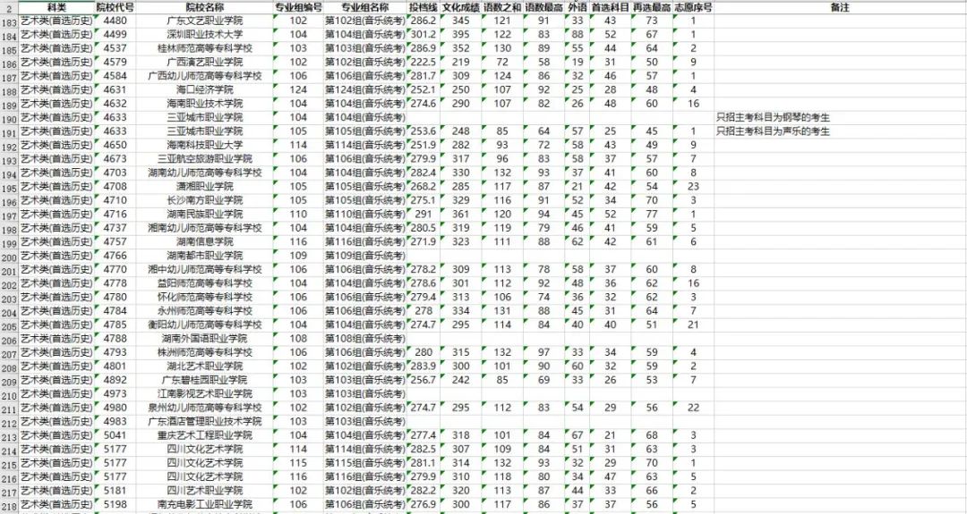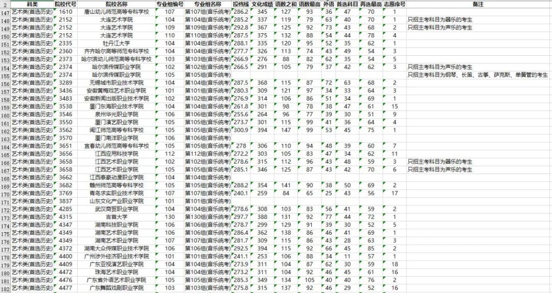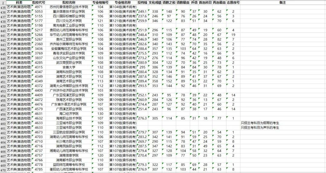 3. 考生文化成绩(含政策性加分)和专业统考成绩须分别达到高职专科相应类别录取控制分数线,选考科目须符合院校专业组的选科要求。招生高校提出的音乐主项投档要求,已在表格备注中做了注明。