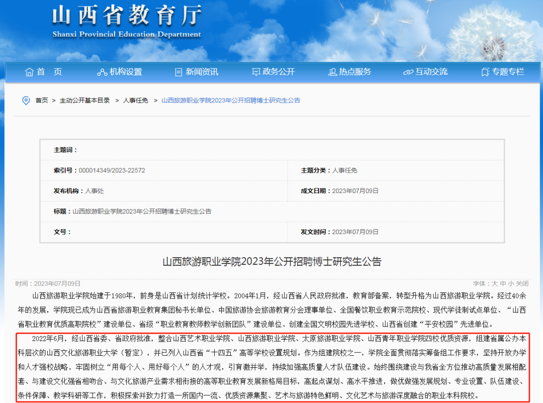 2023年7月29日,山西教育厅发布《山西旅游职业学院2023年公开招聘博士研究生公告》,其中再次提到组建一事。